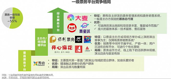 业内将演出票务市场分为一级市场和二级市场,其中,一级市场指大麦等综合票务平台,以及主办方、场馆直销平台,一级市场采取不溢价不打折的单一定价模式,票源来自主办方。