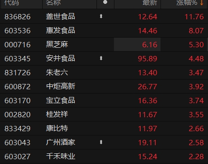 上证报中国证券网讯 1月10日午后,A股食品股震荡走强。13时24分,盖世食品涨超11%,惠发食品涨超8%,黑芝麻、安井食品等冲高。