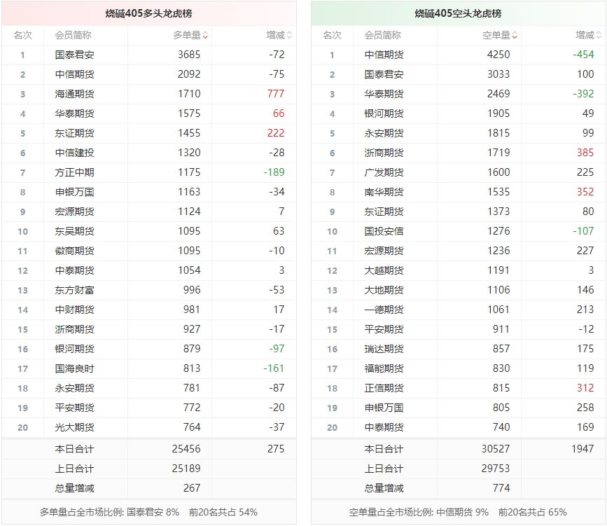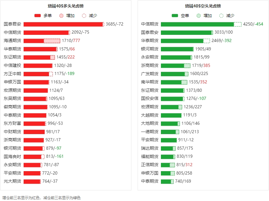 总体而言,烧碱405合约今日减仓上行,多空持仓排名前20席中,多空双方均呈进场态势,多头进场意愿弱于空头。