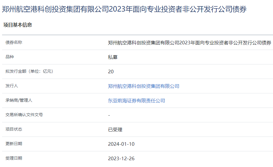 【大河财立方消息】1月10日,郑州航空港科创投资集团有限公司2023年面向专业投资者非公开发行公司债券项目已获上交所受理,本期债券拟发行金额20亿元,承销商/管理人为东亚前海证券。