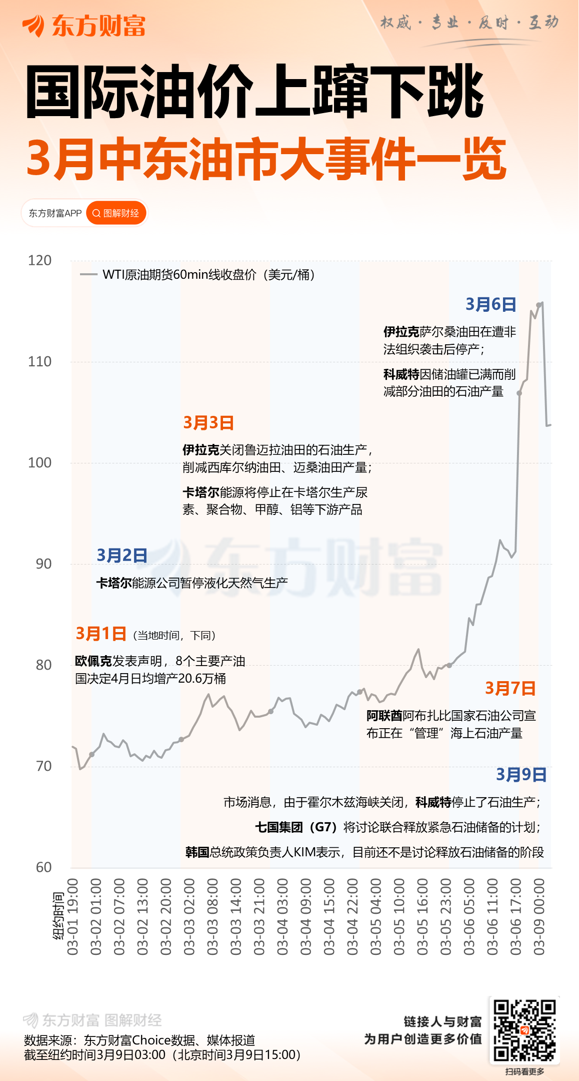 3月9日亚洲交易时段,国际油价出现暴涨。美国原油和布伦特原油期货盘中均突破每桶111美元,为2022年8月以来新高,涨幅一度分别超22%和19%。